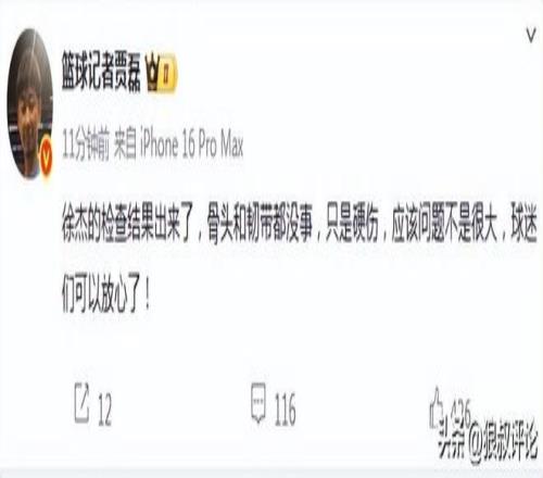 根据篮球记者贾磊爆料,徐杰的检查结果出来了,骨头和韧带都没事,只是硬伤,应该问题不是很大,球迷们可以放心了。