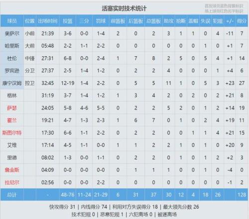 东契奇投篮22中9,三分11中3,罚球13中9,得到30分5板11助8失误,正负值-15,末节0分。詹姆斯17投6中,三分10中3,罚球5中2,得到17分4板4助1断1帽5失误,正负值-16,下半场仅得2分。活塞坎宁安砍下27分5板11助!