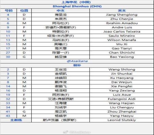 北京时间12月10日,亚冠精英联赛,上海申花客场挑战广岛三箭,双方首发目前已经公布。